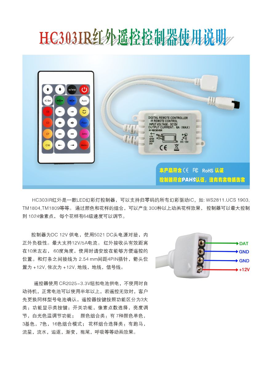 1、红外24键2811幻彩控制器用于控制以2811为驱动芯片的幻彩灯条;